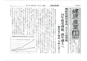 健康産業新聞は、1975年創刊の健康産業界の専門紙です。40年以上の歴史を持つ業界のオピニオンリーダー紙として、業界を網羅する幅広い購読者を抱えています。健康食品・化粧品の定番素材から話題の新素材など市場を徹底検証する特集企画のほか、行政ニュース、最新のエビデンス情報など多様な記事を掲載しております。