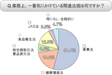 こうしたなかで、「気にかけている関連法規は」の質問には、予想通り(A)薬事法が5割を超える回答となりました。薬事法が健康食品を取り締まることに違和感が出ており、その根拠が分かりにくいという声は多くあります。