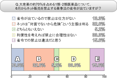 健康食品業界では概ねネット販売について好意的な声が聞かれましたが、アンケート調査で見る限り、ドラッグストア側の主張と二分される結果となりました。