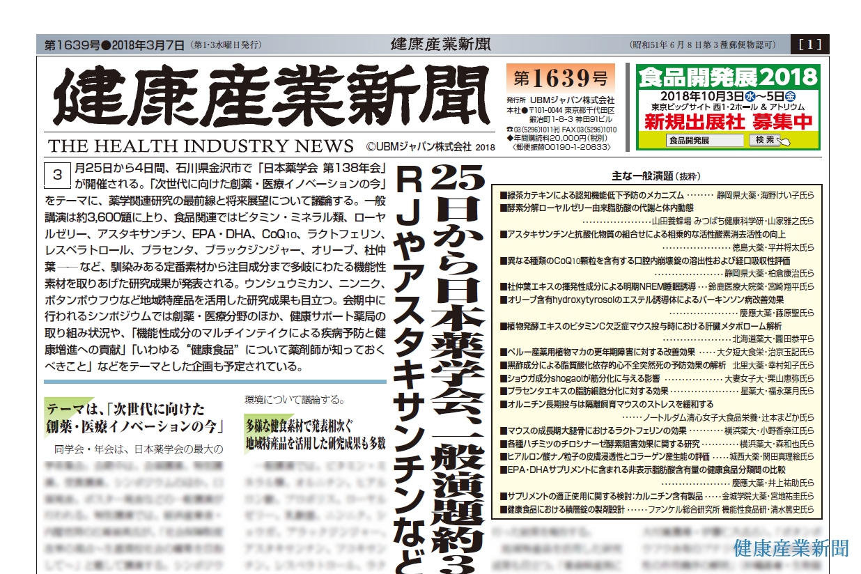 ・RJやアスタキサンチンなど、健康機能の発表続々 -25日から日本薬学会、一般演題約3600題-