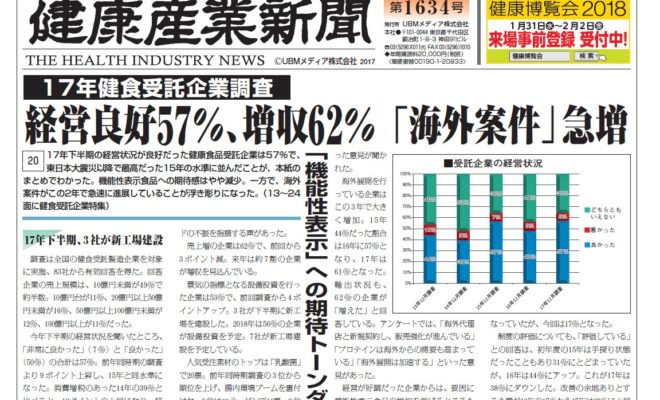 健康産業新聞(第1634号) 主な記事・特集・17年健食受託企業調査 経営良好57%、増収62%「海外案件」急増・既存添加物、「削除候補」に196品・<特集>健食受託加工・製造 大手と小規模、収益格差進む・<特集>サ…