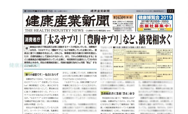 健康産業新聞(第1650号)8月15日発行 「太るサプリ」「豊胸サプリ」など摘発相次ぐ、健食製造業「要許可」か「要届出」か厚労省食品規制で検討開始、<特集>青汁 ほか