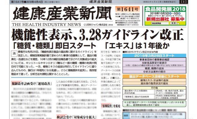 健康産業新聞(第1641号) 主な記事・特集・機能性表示、3.28ガイドライン改正「糖質・糖類」即日スタート「エキス」は1年後か・【話題追跡】HMB,新製品が続々 原料は多数も、品質の見極め必要?・【連載】「機能性表示食…