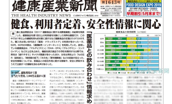 健康産業新聞(第1643号)主な記事・特集・健食、利用者定着、安全性情報に関心・不当表示監視、7月からウェブで通報受付 東京都・厚労省、食薬区分改正を通知、6成分を規制緩和・意見募集で判定覆る、健康茶成分「医」から「非医…
