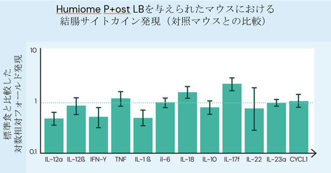 Humiome®Post LBの製造に使用される細菌株は、他のラクトバチルス株と比較して分化した腸上皮細胞に直接付着する強力な能力を持っており、①タイトジャンクション構造に重要な役割を果たすタンパク質(ZO-1,3,9)を強化し腸管バリア機能を維持②病原体が腸粘膜に付着するのを防ぎ、腸内細菌叢を保護③ビフィズス菌や腸の免疫を活性化するIL-17f1(サイトカイン)の増加(図1)、これら3つの働きにより腸の健康と免疫力をサポートする。