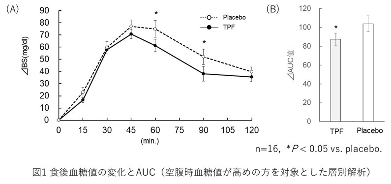 今回、新たに健常成人30名を対象としたランダム化二重盲検プラセボ対照クロスオーバー試験を実施。200gの白米と800mgのTPFを溶解した水を被験者に摂取させ、摂取前と摂取15分 30分、45分、60分、90分、120分後の血糖値の測定を行った結果、空腹時血糖値が高めの被験者を対象とした層別解析において、TPFを摂取した群はプラセボ群に対して、摂取後60分および90分後の血糖値の有意な上昇抑制とAUC値の低下が認められた(図1)。