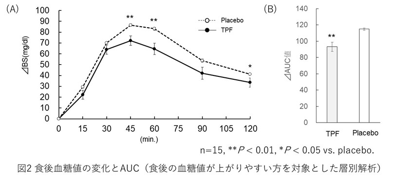 また、血糖値が上がりやすい被験者を用いた解析では、TPFの摂取はプラセボと比較して、45分、60分、120分後における有意な血糖値の上昇抑制効果および、AUC値の低下を確認(図2)。TPFの摂取により、食後血中中性脂肪値の上昇抑制効果も有することを確認しており、今後、機能性表示食品素材としての開発を進めていく、としている。