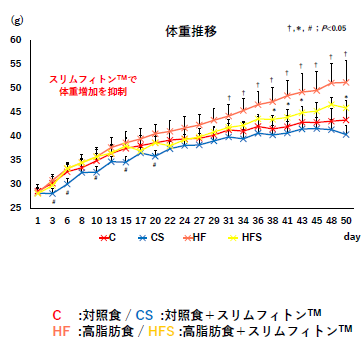 マウスを用いた試験では、スリムフィトン™を吸入させることによってターメロン類が血清および各種臓器へ移行することが確認され、特に脂肪組織に多く移動することが判明している。また、高脂肪食を与えられたマウス(HF)と高脂肪食に加えてスリムフィトン™を吸入したマウス(HFS)では、HFSの方が血糖値の上昇、精巣上体周囲脂肪組織脂肪量の増加、脂肪細胞の肥大化、体重増加が有意に抑えられたことを確認した(表)。
