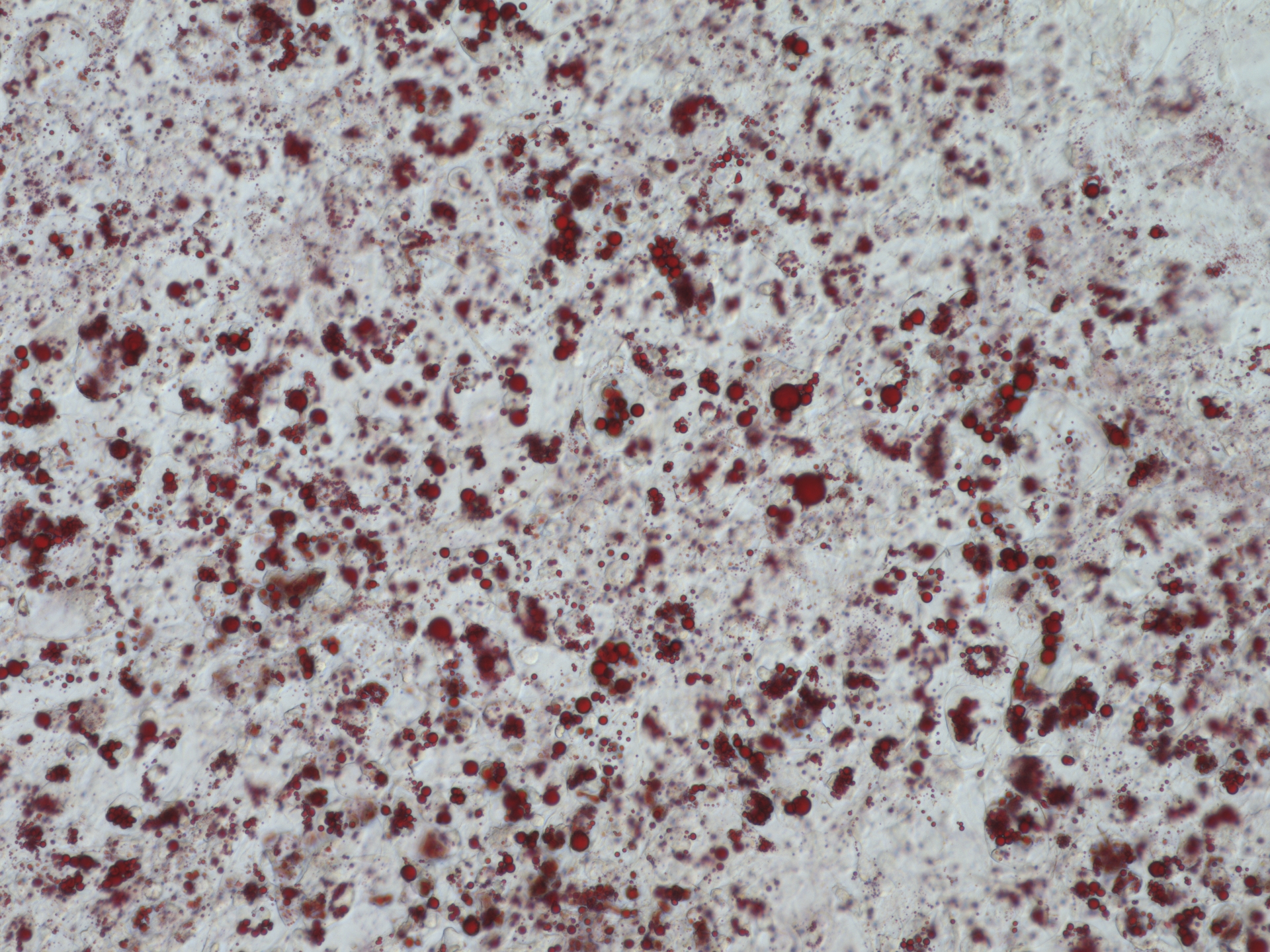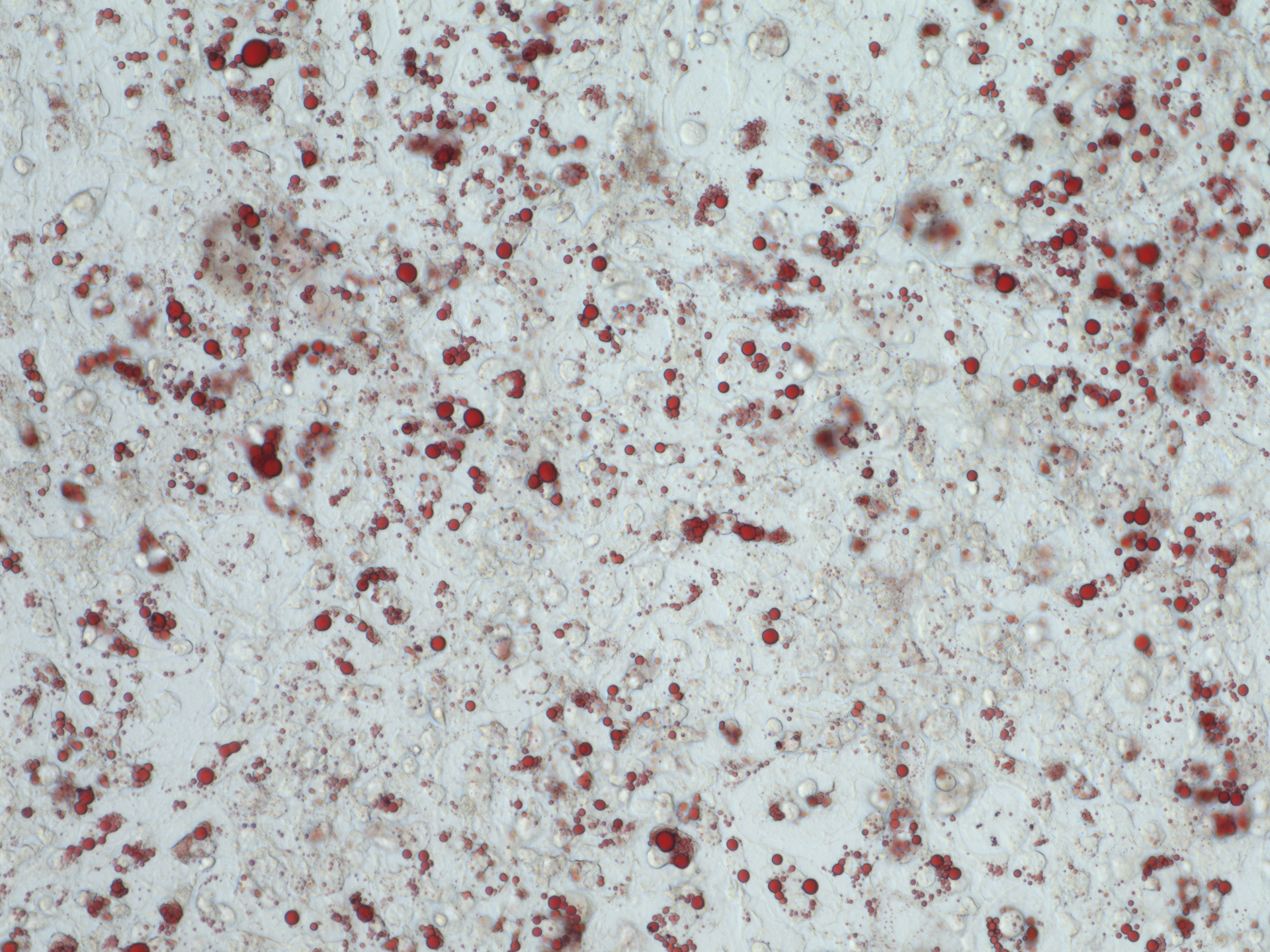 その結果、RICEO-EXによって、血流調節因子COX1及び血管拡張因子eNOS、さらに血管構造安定化因子Tie2の遺伝子発現量の上昇を確認。eNOS遺伝子およびTie2遺伝子発現量は濃度依存的に上昇し、0.1%の添加量でそれぞれ1.5倍~2倍に上昇した。また脂肪細胞の油滴蓄積について染色画像を用いて評価したところ、0.1%の添加量で大幅な低減効果を確認している。