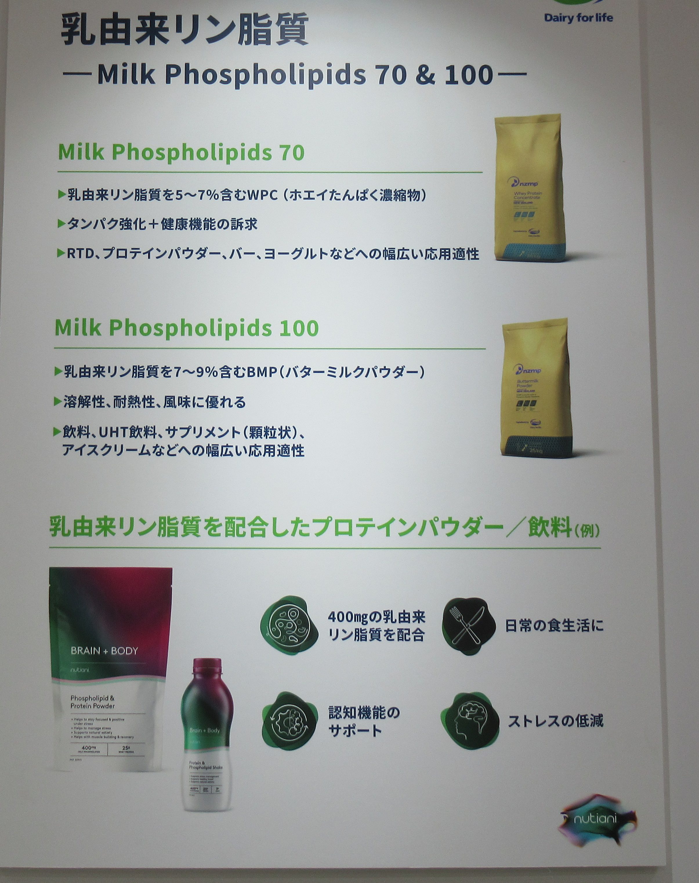 ●フォンテラジャパンは、機能性素材の新たなブランド「nutiani(ニューティアニ)」を立ち上げました。その第一弾の製品として乳由来リン脂質を提案していました。