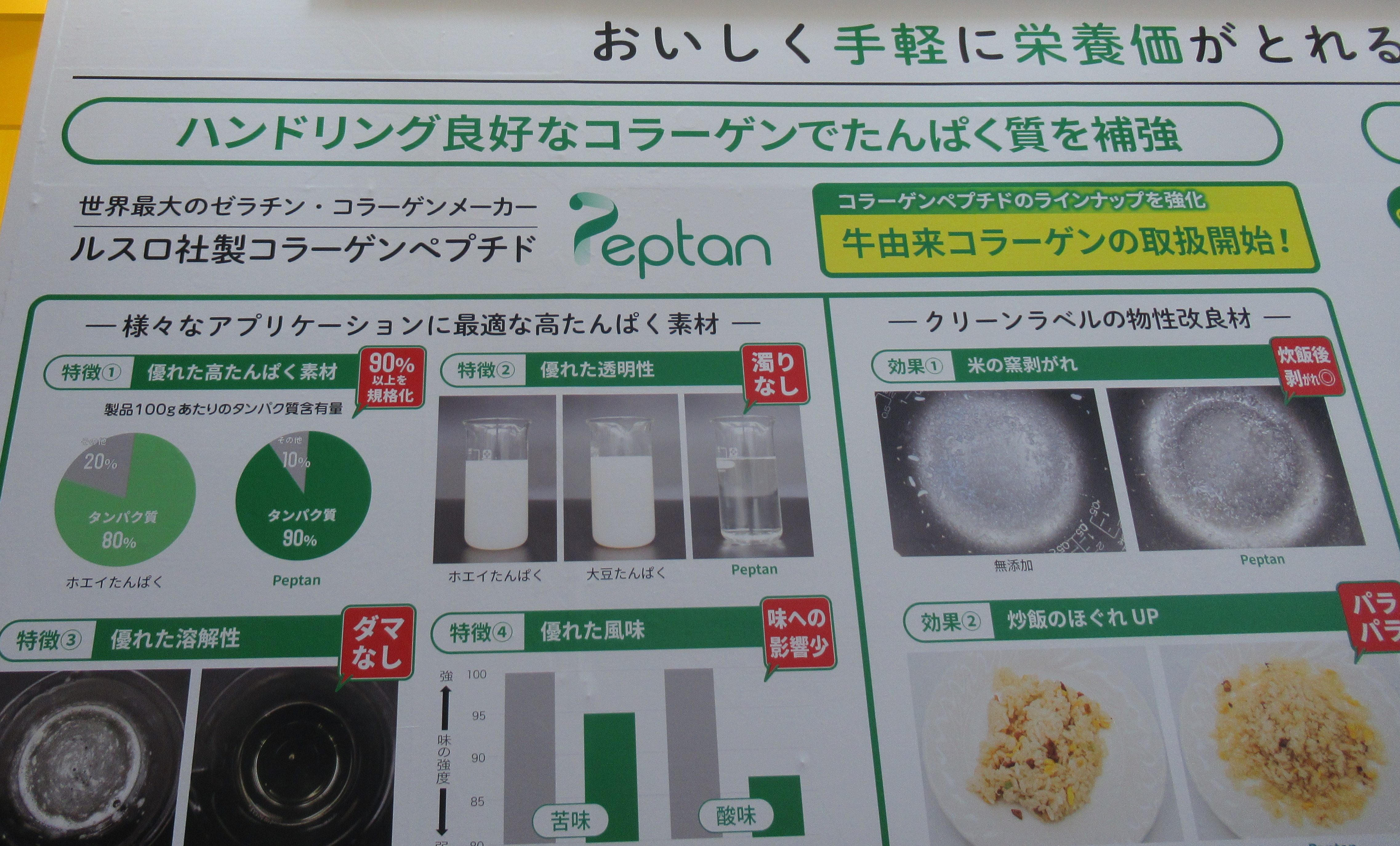 ●ユニテックフーズでは、コラーゲンをたん白素材として提案していました。吸収性が良く、ハンドリングも良好で、いろいろな製品に配合しやすいようです。