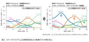 次に、各試料の食感の「リッチ感」のスコアを目的変数、TDSカーブから算出した各食感要素の曲線下面積(AUC;area under the curve )、さらに、概念が対となる食感要素どうしのAUCの差分(および絶対値)を説明変数として多変量解析を行うことで、「リッチ感」の推定式を得た(特許第7268217号)。その結果、食感の「リッチ感」は、付着感に関する「ねっちり」と「さくい」、舌ざわりに関する「なめらか」と「シャリシャリ」、後口に関する「もったり」と「すっきり」といった食感要素で構成されることが明らかとなった。また、冷菓用安定剤等の種類や添加量によって上記の食感要素をコントロールすることで、「リッチ感」を高められることが示された(図2)。この手法は、低脂質や低糖質の冷菓の食感改良にも応用できる、としている。