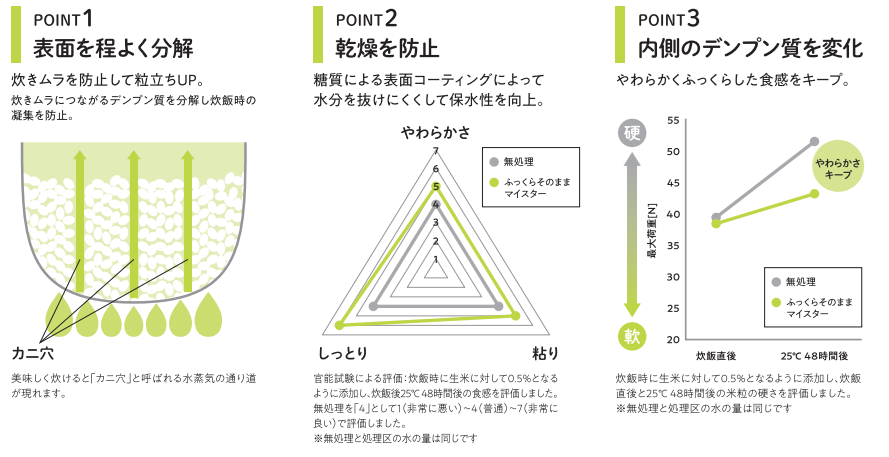 米飯は通常、時間の経過とともにデンプンの老化が進み、パサつき硬くなるが、本品に配合している酵素がデンプン分子を分解するとともに、米の内部ではデンプン鎖が水を保持することでパサつきの発生を抑制する。また保水効果のある糖質を含有するため、糖質が米の表面をコーティングするように作用することで水分を抜けにくくする効果もある(図)。