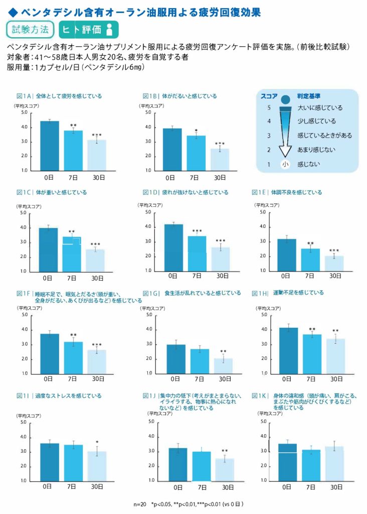 疲労を自覚する41〜58歳の男女20名にペンタデシル6 mgを含むソフトカプセルを1日1カプセル、30日間摂取させた前後比較試験では、7日目に「全体として疲労を感じる」「体がだるい」「体が重い」など主要3項目が有意に低下し、30日目には「疲れが抜けない」「睡眠不足によるだるさ」を含む11項目中10項目で有意差(p<0.05〜0.001)が認められ、短期・継続の双方で疲労感の大幅な軽減が示された。