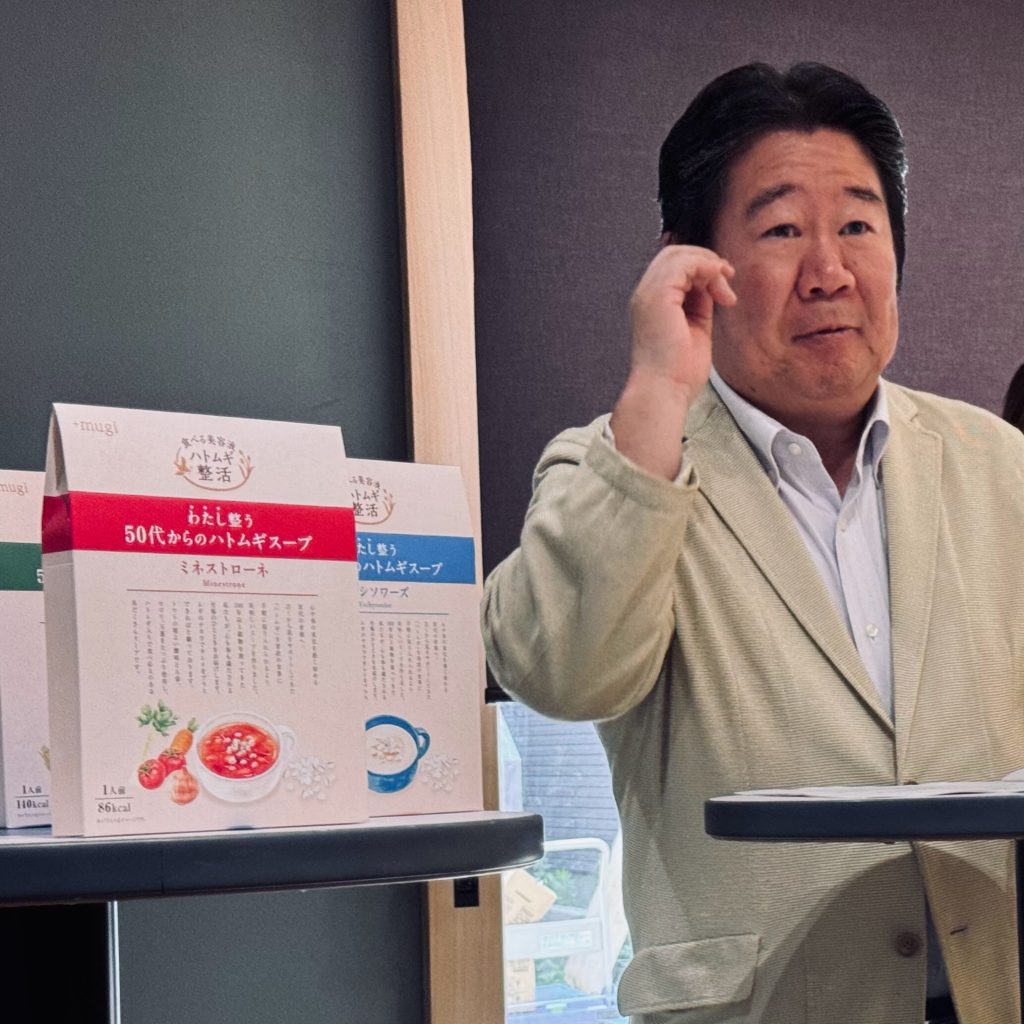 まず、同社代表取締役社長、田中重光氏が登壇。田中社長は、同社が今年2月24日に創業130周年を迎えたことに触れ、米穀肥料業から始まり現在はハトムギや大麦を中心とした健康的な食品に注力していると説明した 。また、これまでの「素材」提供から脱却し、手軽に摂取できる完成品としての製品開発を強化しているとし、その一環として新ブランドカテゴリ「ハトムギ整活」を立ち上げたと述べた。「ハトムギ整活」は生活の「活」ではなく「整える活動」を意味し、その第一弾が今回のスープであると紹介した。