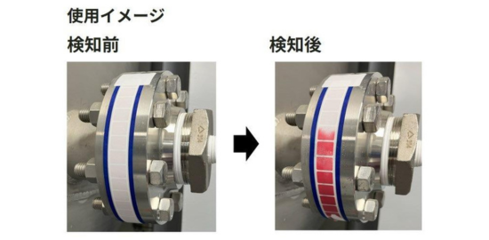 同品は、検知部が露出した構造となっており全方面からの油を検知する事ができる。また1滴の油でも「白」→「赤」へと明瞭に変色し、発見しづらい油漏れを瞬時に可視化する事が可能となっている(写真)。