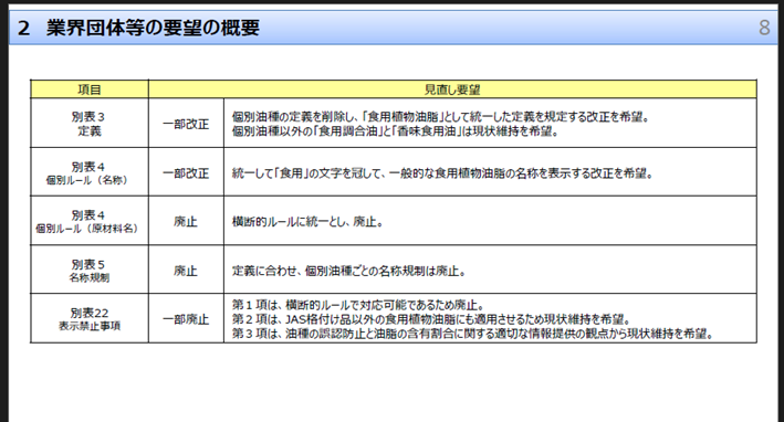 日本植物油協会では、原材料表示内では原料油脂名に統一して表記するのが世界的に見てもスタンダードであり、起源原料名と原料油脂名が混在して表記されるケースはそう多くならないと考えているが、協会ガイドラインなどでなんらかの対応をしたいとしている。概ね協会の要望通りとなる見通し。