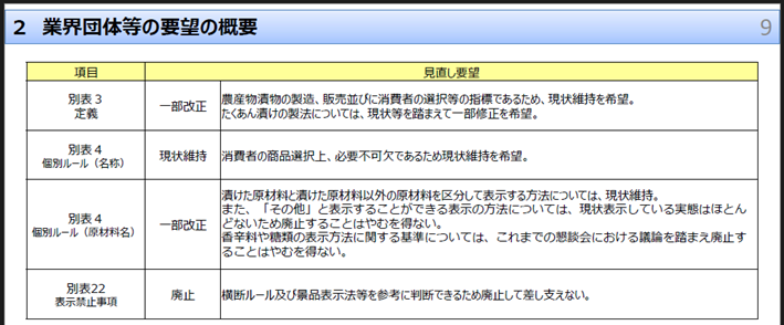 また別表第3の定義のうち、たくあん漬けについては一部改正を要望。干し上げの記述内にある「天日干しで水分を除くこと」の文言を削除し、機械等による乾燥にも対応させたいとした。先述した別表第4 原材料の項目を除き、概ね連合会の要望通りとなる見通し。