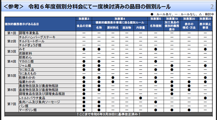 JAS法において個別品目ごとに定められていた表示ルールについては、基本的には食品表示の一元化の際に、そのまま食品表示基準に移行しており、個別品目の在り方などの議論は十分にされていない状況であった。そのため、横断的な基準に合わせる方向で見直すことを基本としつつ、食品ごとの個別の事情や制定の経緯、消費者や事業者の要望等を踏まえた検討が進められている。
