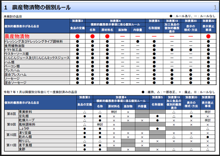 焦点となったのは別表第4 原材料の項目である。漬物の場合には「漬けた原材料」と「漬け原材料」を分けて表記することが本項内で定められており、連合会としてはこれを維持したい考え。一方分科会委員からは、①横断的ルールに沿って重量順に表記する場合でも、従来通りのグループ分け表記は可能であること②佃煮などの伝統的な食品の原材料表示で、砂糖や醤油といった調味料が主な原料より先に表示される例があること③消費者が主原料や添加物の割合を把握し、製品選びの助けとする原則から、本項目の廃止依頼が再度出された。