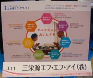 1月24日(水)、25日(木)の両日、東京ビッグサイトにおいて「メディケアフーズ展(ケアショー・ジャパン)」が開催された。三栄源エフ・エフ・アイは本展示会にて「減塩」と「糖質制限」についてのトータル提案を行った。減塩や糖質制限を考える際には単に塩分や糖質を減らすだけでなくおいしさを損なわない製品づくりが大事であるとし、食品添加物の機能を説明しながら、おいしい食品づくりに役立つ製品と利用方法を紹介した。