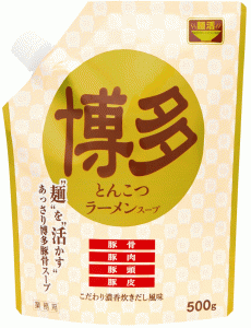 新商品は豚骨、豚肉、豚頭、豚皮などから炊きだしたポークエキスがベースのとんこつ風味豊かなラーメンスープ。本品30g~40gに対し、お湯280mlを加え、よくかき混ぜれば出来上がる。とんこつラーメンをはじめ、とんこつつけ麺、もつ鍋、焼きラーメンなどにも応用できる。