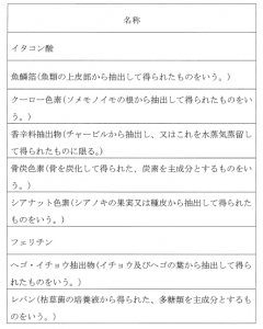 消除されたのは、イタコン酸、魚麟箔、クーロー色素、香辛料抽出物(チャービルから抽出し、又はこれを水蒸気蒸留して得られたものに限る。)、骨炭色素、シアナット色素、フェリチン、ヘゴ・イチョウ抽出物、レバン(表参照)。既存添加物名簿から消除された添加物は、食品衛生法(昭和22年法律第233号)第10条の規定に基づき、その販売、又は販売の用に供するための製造、輸入、加工若しくは使用等が禁止される。同日付での適用。