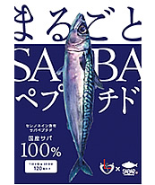 サバペプチドの利用は、錠剤やカプセル型のサプリメントはもちろん、ドリンクにも使え、サバのうまみ成分も含んでいることからパスタソースなどの調味食品にも利用できる。サバ関連の食品・製品を専門に扱っている大阪の(株)鯖やと共同展開を行っており、食品分野ではすでにスープや調味料などに応用が進んでいる。サプリメント分野でも同社とコラボした「まるごとSABAペプチド」(写真)を自社ブランドで発売した。希望小売価格は3838円(税別)。