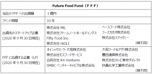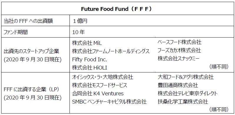 FFFは、2019年10 月に日本の食のスタートアップエコシステム(スタートアップ企業を成長させ、 事業を加速させる仕組み)を作るために、フードイノベーション領域に特化した国内外のスタートアップ企業への出資を目的としてオイシックス・ラ・大地株式会社の子会社Future Food Fund株式会社が設立したCVC。今回の出資を通じて、FFFが出資するスタートアップ企業と協業・連携することで、今後成長が期待されるフードテック(※)市場を念頭に、「食を通じて人々の暮らしを豊かにすること」ができる新規事業・製品の創出を目指す。