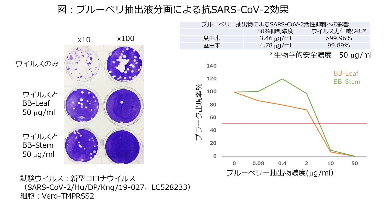 実験には、ブルーベリー種(品種:くにさと35号)の茎・葉の熱水抽出物から得られた10種類の種類の抽出分画を使用した。くにさと35号は宮崎県と宮崎大学が共同開発した新品種のブルーベリー種で、茎・葉にはポリフェノール類を豊富に含む。アフリカミドリザル腎臓上皮由来の培養細胞(Vero 細胞)にサンプルを添加して5 時間後、新型コロナウイルス液(1x10⁴ PFU)を加えて2 時間静置してウイルスを細胞に感染させ、その後、ウイルスを含まない新しい培地(サンプルを含む)に代えて、3日間培養し、ウイルス感染価をプラークアッセイで算出した。