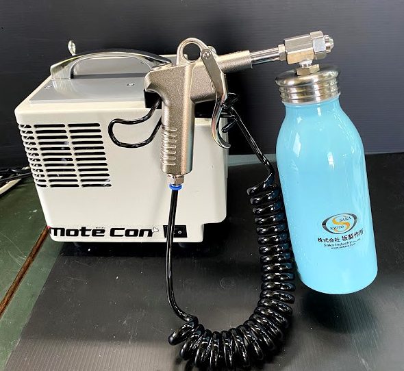 コンプレッサーの制御も工夫しており、ノズルガンを握ると噴霧できる仕様になっている。一般的に採用されている吸い上げ式の液体噴霧ノズルは、シンプルな構造である反面、大きな吐出空気容量が必要なため中型コンプレッサーが用いられることが多く、一般の人では取り扱いが困難であった。