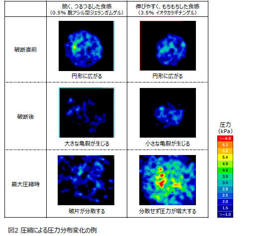 具体的には、縦44点、横44点の2次元に配置された感圧点をもつセンサーシート上にゲル状食品をおき、垂直方向に圧縮した時のセンサーシートにかかる圧力分布を計測(図1)する。例えば、脱アシル型ジェランガムのような脆く、つるつるとした食感のゲルの場合、破断後から圧力がかかる点の分布が大きく、ばらばらに散らばっている様子が観察される。一方、イオタカラギナンのような伸びやすくもちもちした食感のゲルでは、破断後においても圧力がかかる点の分布はばらばらにならず、ゆっくりと広がっていく(図2)。この圧力分布の時間変化を解析することによって、「つるつる感」、「ざらざら感」、「もちもち感」、「ねっとり感」のようなゲル状食品の表面特性に関する食感を精度よく推定できる(特許6324741号)。