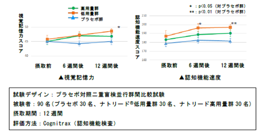 その結果、Cognitraxテストにおいて、視覚記憶力、認知機能速度、運動速度で12週時に低用量群がプラセボ群と比較して有意に改善することが判明。高用量群では、プラセボ群との有意差は認められなかったものの、上記3項目において改善傾向が認められた(図)。また、プラセボ群では、同3項目のうち、視覚記憶力と運動速度においてスコアの改善が見られなかったことから、ナトリード®高用量もしくは低用量摂取により、視覚記憶力、認知機能速度、運動速度の改善が示された、としている。