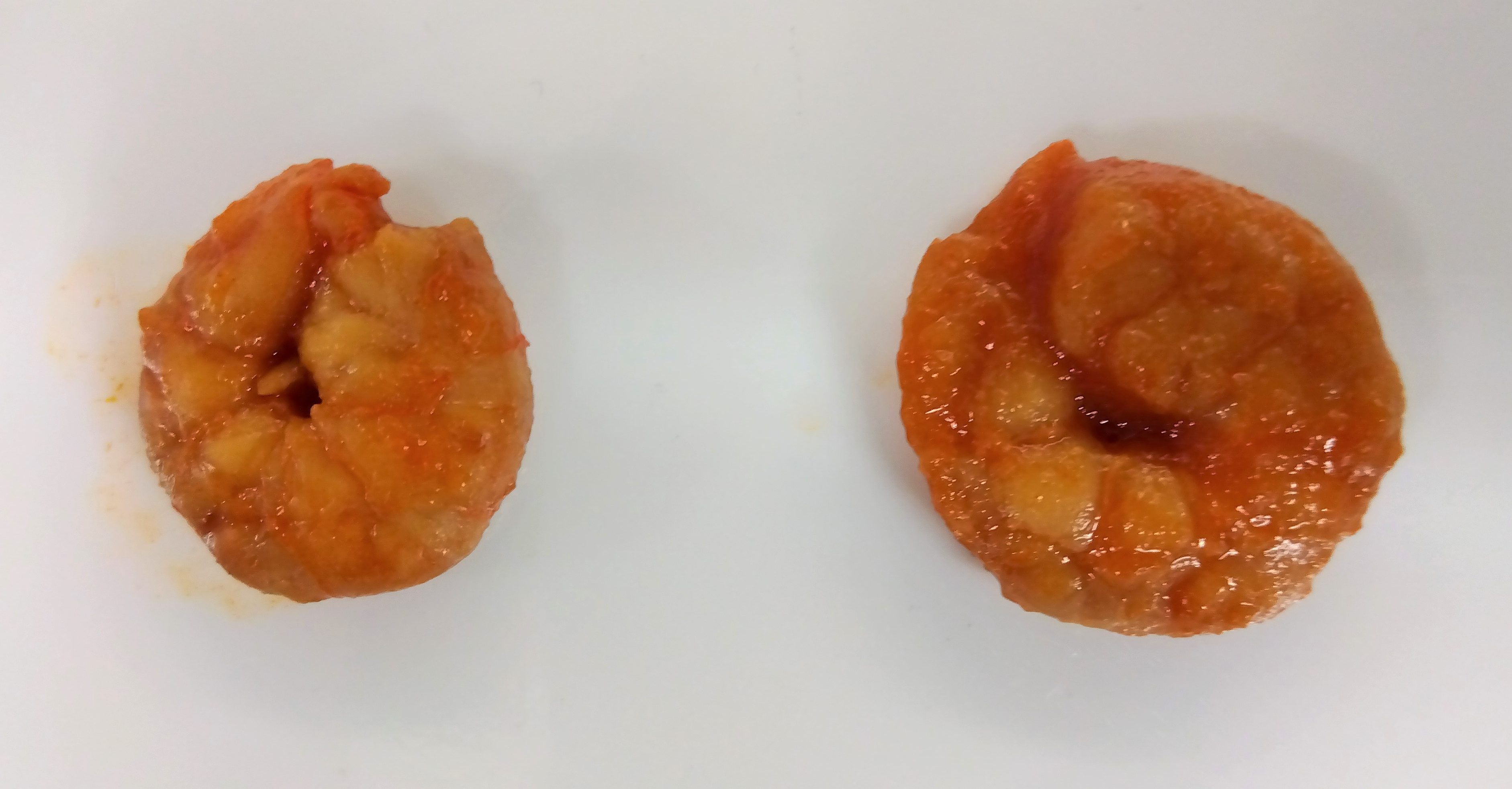 同品の4%水溶液(対肉50%液量、対肉製剤濃度2%)を作成し、バナメイエビ(サイズ71/90)をタンブリングして1時間静置後、スチーム加熱を90℃、5分間実施し、その後トマトソースでレトルト加工した比較試験(ブラインドテスト)では、官能評価において、ジューシー感やプリプリ感、弾力、味、香りすべての項目でコントロール(無処理)よりも優れることが判明。とりわけ、ジューシー感、プリプリ感、弾力に優れる結果となり、12.5%の歩留まりアップを確認している(画像)。
