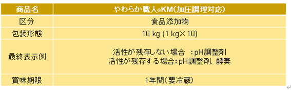 「やわらか職人(R)KM」は、レトルト製品・加圧調理食品など常温流通を想定した加工食品向けの食感改良剤で、酵素とたん白によって発生する特殊なゲルによって加圧調理時の筋繊維間のダメージを補完し食感を保つ(特許出願中)。タンブリングまたは浸漬後、レトルト加熱調理する前処理として一次加熱調理を行うことでレトルト時の食感低下をさらに防止することができる。