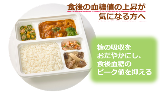 ミールタイムの利用者には食後血糖を気にする人が多いことを踏まえ、食後血糖のピーク値を抑える機能が報告されているグアーガム分解物(食物繊維)を関与成分として商品を開発。グアーガム分解物は病院や介護分野でも支持されている食物繊維で、安心して利用してもらえるようメニュー設計した。