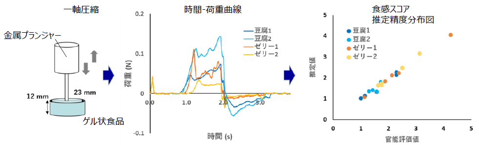 食感評価法の概念図 ゲル状食品を圧縮して得られる荷重値から食感スコアを推定する