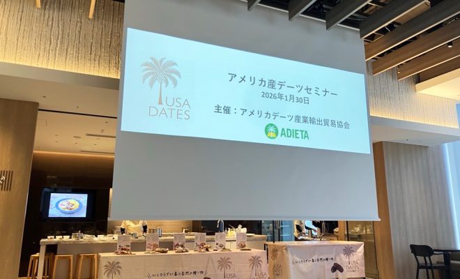 アメリカデーツ産業輸出貿易協会は1月30日、TOKYO TORCH 常盤橋タワーのHall and Kitchenにて「アメリカ産デーツセミナー」を開催した。アメリカ産デーツの特徴や協会の活動を紹介するプレゼンテーションの後、アメリカ産デ…
