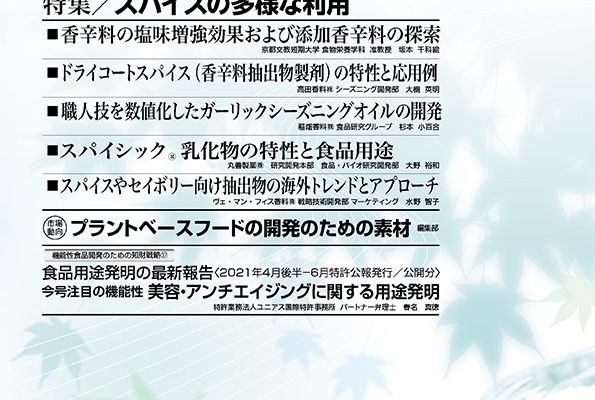 特集/スパイスの多様な利用■香辛料の塩味増強効果および添加香辛料の探索京都文教短期大学 食物栄養学科 准教授 坂本千科絵■ドライコートスパイス(香辛料抽出物製剤)の特性と応用例高田香料(株)シーズニング開発部 大槻英明■…