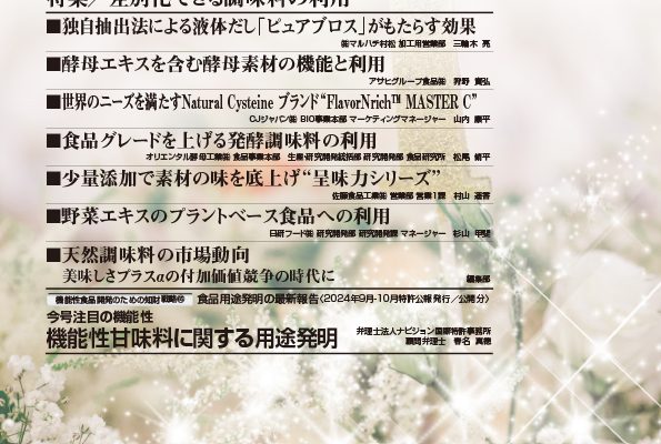 特集/差別化できる調味料の利用■独自抽出法による液体だし「ピュアブロス」がもたらす効果(株)マルハチ村松 加工用営業部 三輪木 亮■酵母エキスを含む酵母素材の機能と利用アサヒグループ食品(株)狩野貴弘■世界のニーズを満た…