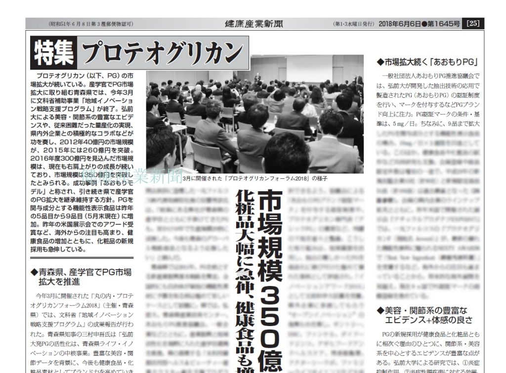今年3月に開催された「丸の内・プロテオグリカンフォーラム2018」(主催・青森県)では、文科省「地域イノベーション戦略支援プログラム」の成果報告が行われた。青森県知事の三村申吾氏は「弘前大発PGの活性化は、青森県ライフ・イノベーションの中核事業。豊富な美容・関節データを背景に、今後も健康食品・化粧品素材としてブランド力を高めていきたい」と語った。