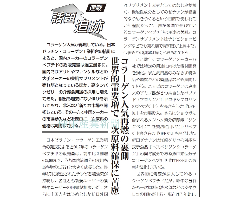 日本ゼラチン・コラーゲン工業組合の発表によると2017年のコラーゲンペプチドの販売量は、前年比2割増の5,800 tで、うち国内流通分の食用も15%増の4,772 tと大きく成長した。昨年3月に放送されたテレビ番組効果が持続し、各社とも新規ユーザーの獲得やユーザーの回帰が相次いだ。さらに中国人をはじめとした訪日外国人観光客の購入も後押し。新規用途としては2015年に改定された日本褥瘡学会の褥瘡予防・管理ガイドライン(第4 版)にも掲載されている褥瘡予防を目的とした病院食としての利用や高タンパクの介護食の採用も進んでいる。