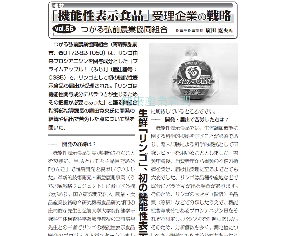 つがる弘前農業協同組合(青森県弘前市)は、リンゴ由来プロシア二ジンを関与成分とした「プライムアップル!(ふじ)」(届出番号:C385)で、リンゴとして初の機能性表示食品の届出が受理された。「リンゴは機能性関与成分にバラつきが生じるためその把握が必要であった」と語る同組合指導部指導課長の廣田寛央氏に開発の経緯や届出で苦労した点について話を聞いた。