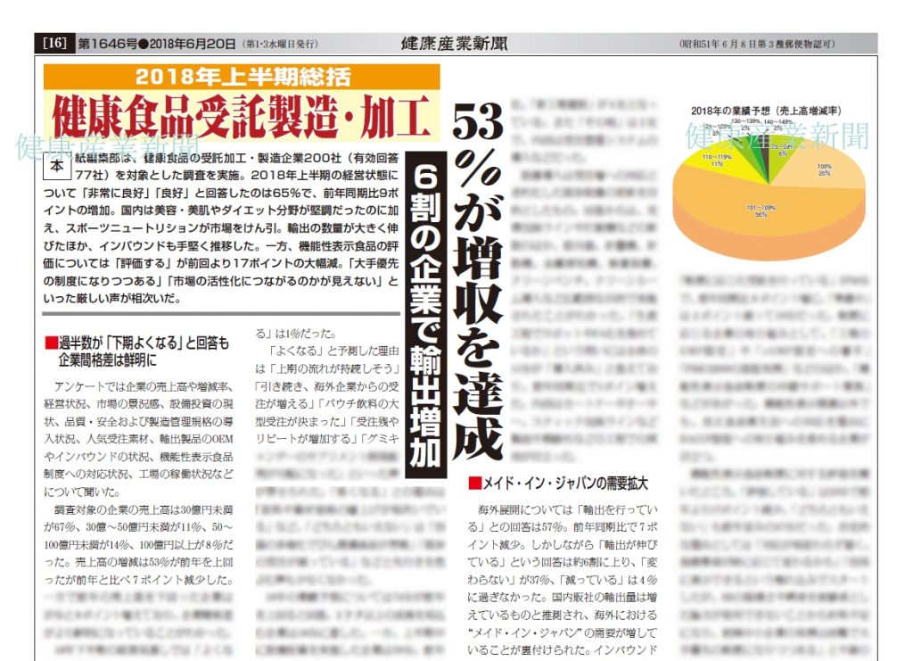 紙編集部は、健康食品の受託加工・製造企業200社(有効回答77社)を対象とした調査を実施。2018年上半期の経営状態について「非常に良好」「良好」と回答したのは65%で、前年同期比9ポイントの増加。国内は美容・美肌やダイエット分野が堅調だったのに加え、スポーツニュートリションが市場をけん引。輸出の数量が大きく伸びたほか、インバウンドも手堅く推移した。一方、機能性表示食品の評価については「評価する」が前回より17ポイントの大幅減。「大手優先の制度になりつつある」「市場の活性化につながるのかが見えない」といった厳しい声が相次いだ。