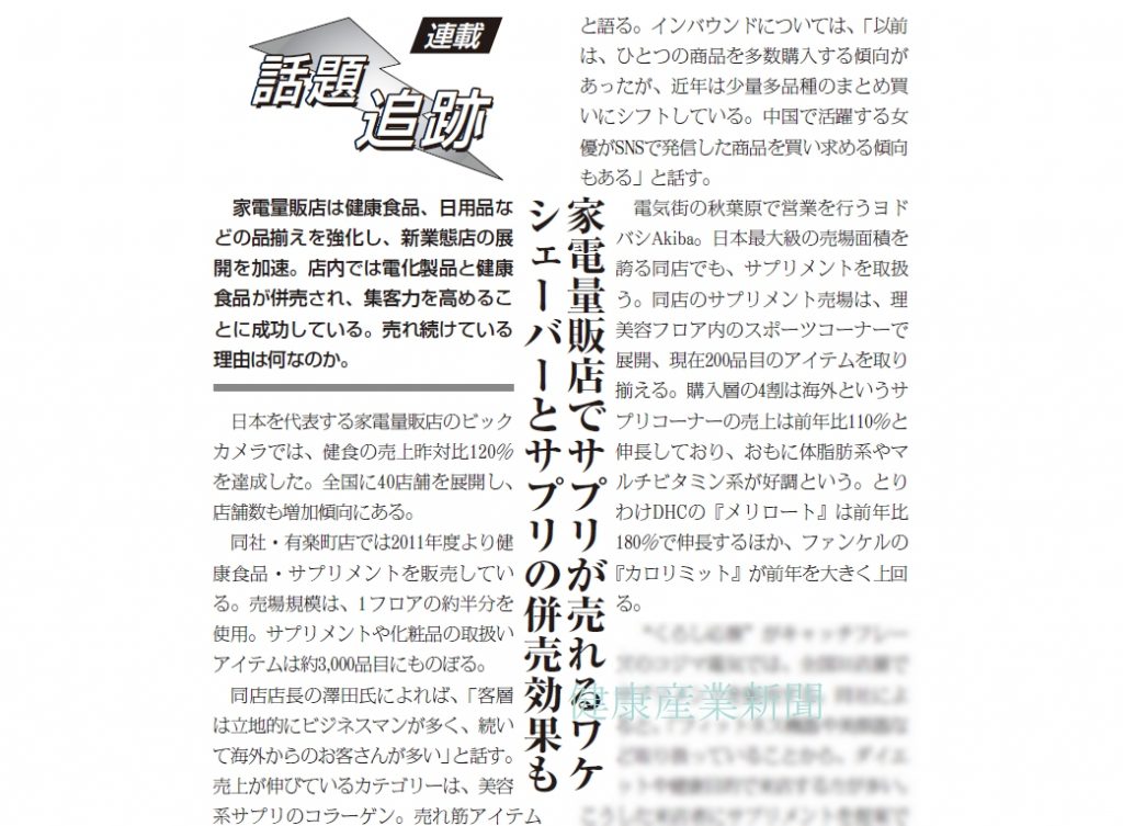 日本を代表する家電量販店のビックカメラでは、健食の売上昨対比120%を達成した。全国に40店舗を展開し、店舗数も増加傾向にある。