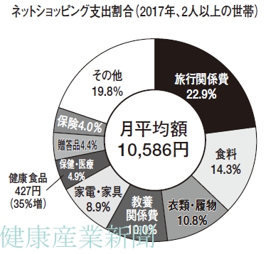 総務省統計局は先月29日、2017年の「家計消費状況調査年報」を公表、健康食品のネットショッピング支出額は前年比35%増と急伸した。