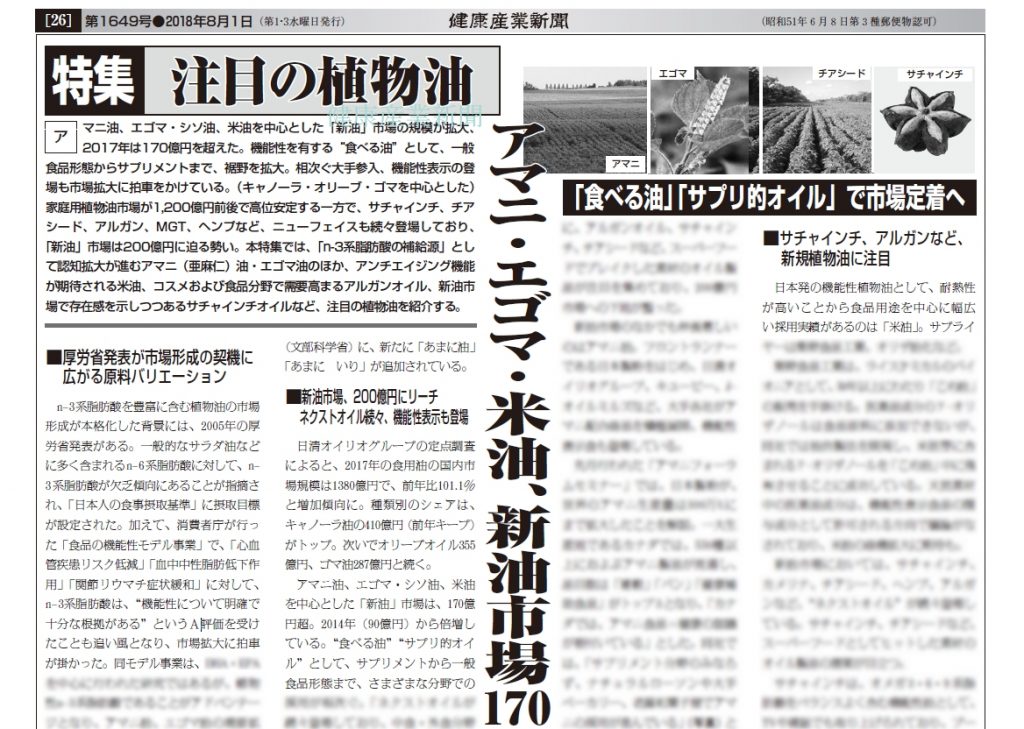 アマニ油、エゴマ・シソ油、米油を中心とした「新油」市場の規模が拡大、2017年は170億円を超えた。機能性を有する“食べる油”として、一般食品形態からサプリメントまで、裾野を拡大。相次ぐ大手参入、機能性表示の登場も市場拡大に拍車をかけている。(キャノーラ・オリーブ・ゴマを中心とした)家庭用植物油市場が1,200億円前後で高位安定する一方で、サチャインチ、チアシード、アルガン、MGT、ヘンプなど、ニューフェイスも続々登場しており、「新油」市場は200億円に迫る勢い。本特集では、「n-3系脂肪酸の補給源」として認知拡大が進むアマニ(亜麻仁)油・エゴマ油のほか、アンチエイジング機能が期待される米油、コスメおよび食品分野で需要高まるアルガンオイル、新油市場で存在感を示しつつあるサチャインチオイルなど、注目の植物油を紹介する。