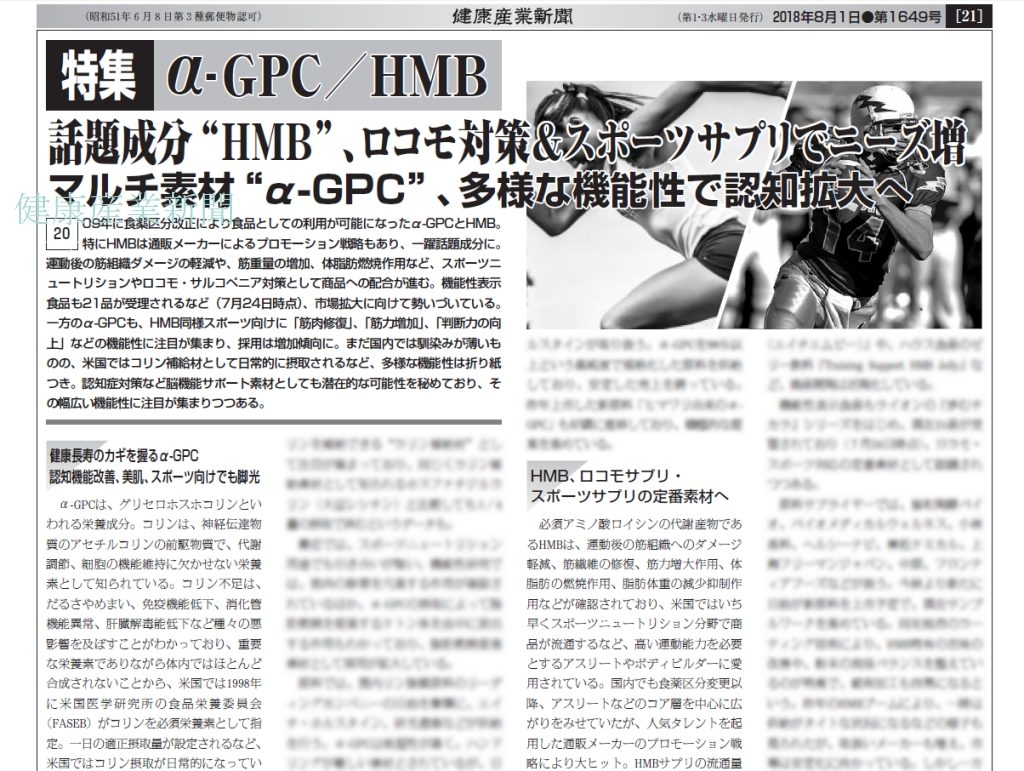 2009年に食薬区分改正により食品としての利用が可能になったα-GPCとHMB。特にHMBは通販メーカーによるプロモーション戦略もあり、一躍話題成分に。運動後の筋組織ダメージの軽減や、筋重量の増加、体脂肪燃焼作用など、スポーツニュートリションやロコモ・サルコペニア対策として商品への配合が進む。機能性表示食品も21品が受理されるなど(7月24日時点)、市場拡大に向けて勢いづいている。一方のα-GPCも、HMB同様スポーツ向けに「筋肉修復」、「筋力増加」、「判断力の向上」などの機能性に注目が集まり、採用は増加傾向に。まだ国内では馴染みが薄いものの、米国ではコリン補給材として日常的に摂取されるなど、多様な機能性は折り紙つき。認知症対策など脳機能サポート素材としても潜在的な可能性を秘めており、その幅広い機能性に注目が集まりつつある。