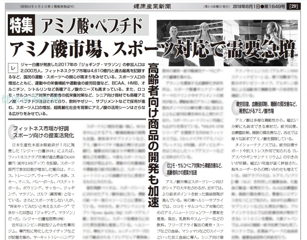 レジャー白書が発表した2017年の「ジョギング・マラソン」の参加人口は2,000万人。フィットネスクラブ市場は4,610億円と過去最高を記録するなど、国民の運動・スポーツへの関心が高まりをみせている。スポーツ人口の増加とともに、運動中の栄養補給や運動後の疲労回復など、BCAA、HMB、オルニチン、シトルリンなど各種アミノ酸のニーズも高まっている。また、ロコモ・サルコぺニア対策や高齢者の低栄養対策など、シニア向け商材でも各種アミノ酸・ペプチドが注目されており、飲料やゼリー、サプリメントなどで採用が進む。スポーツ人口の増加、超高齢化社会を背景にアミノ酸の活用シーンはさらなる広がりをみせている。