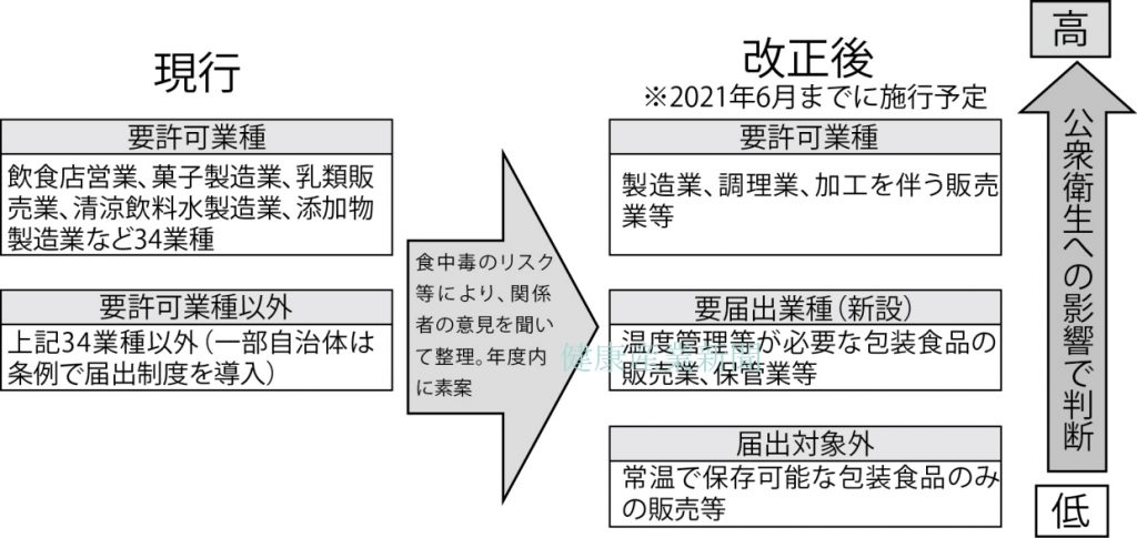 現行制度は、「要許可業種」とそれ以外という位置づけで、一部自治体が届出制度を設けているが、改正後は(1)要許可業種、(2)要届出業種、(3)届出対象外――の3つに整理される。食中毒リスクなど、公衆衛生への影響を鑑みて分類する。